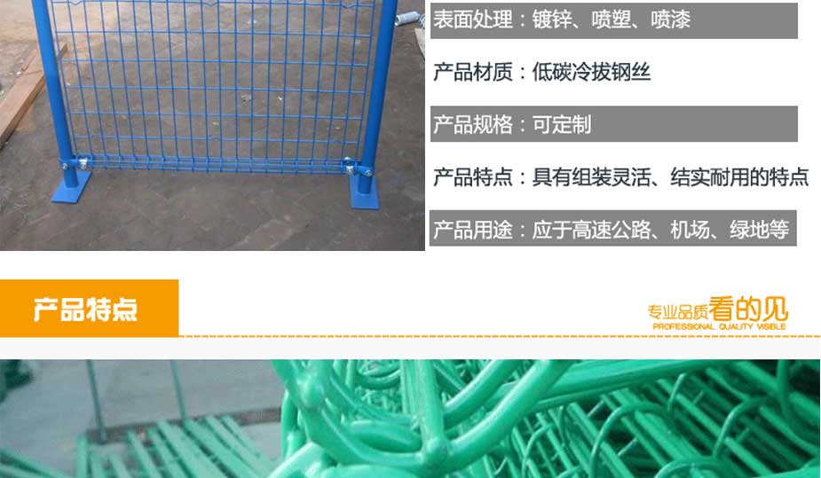 雙圈護欄網(wǎng)是用冷拔低碳鋼絲焊接成網(wǎng)筒狀卷邊與網(wǎng)面一體,采用鍍鋅進(jìn)行不腐處理,具有很強的不腐蝕性,然后進(jìn)行噴、浸塑,各種顏色的噴、浸塑;連接附件與鋼管支柱固定。 規格: 1. 材質(zhì):Q 235低碳冷拔鋼絲 2.浸塑絲經(jīng):4.5--5mm 3.網(wǎng)孔:50mm X 200mm(長(cháng)方孔) 4.尺寸: 2.4m X 3m 結構: 用低碳鋼絲編織焊接成的金屬網(wǎng)沖壓折彎卷成圓筒狀后,用連接附件與鋼管支柱相連固定。 優(yōu)點(diǎn): 具有強度高、鋼性好、造型美觀(guān)、視野寬廣、安裝簡(jiǎn)便,感覺(jué)明亮、輕盈、實(shí)用的特點(diǎn),網(wǎng)片與網(wǎng)柱連接緊湊,整體感好; 上下卷圈使網(wǎng)面強度顯著(zhù)增加。 用途: 用于高速公路、機場(chǎng)、市政綠地、園林花壇、單位綠地、港口綠地的裝飾防護。 |